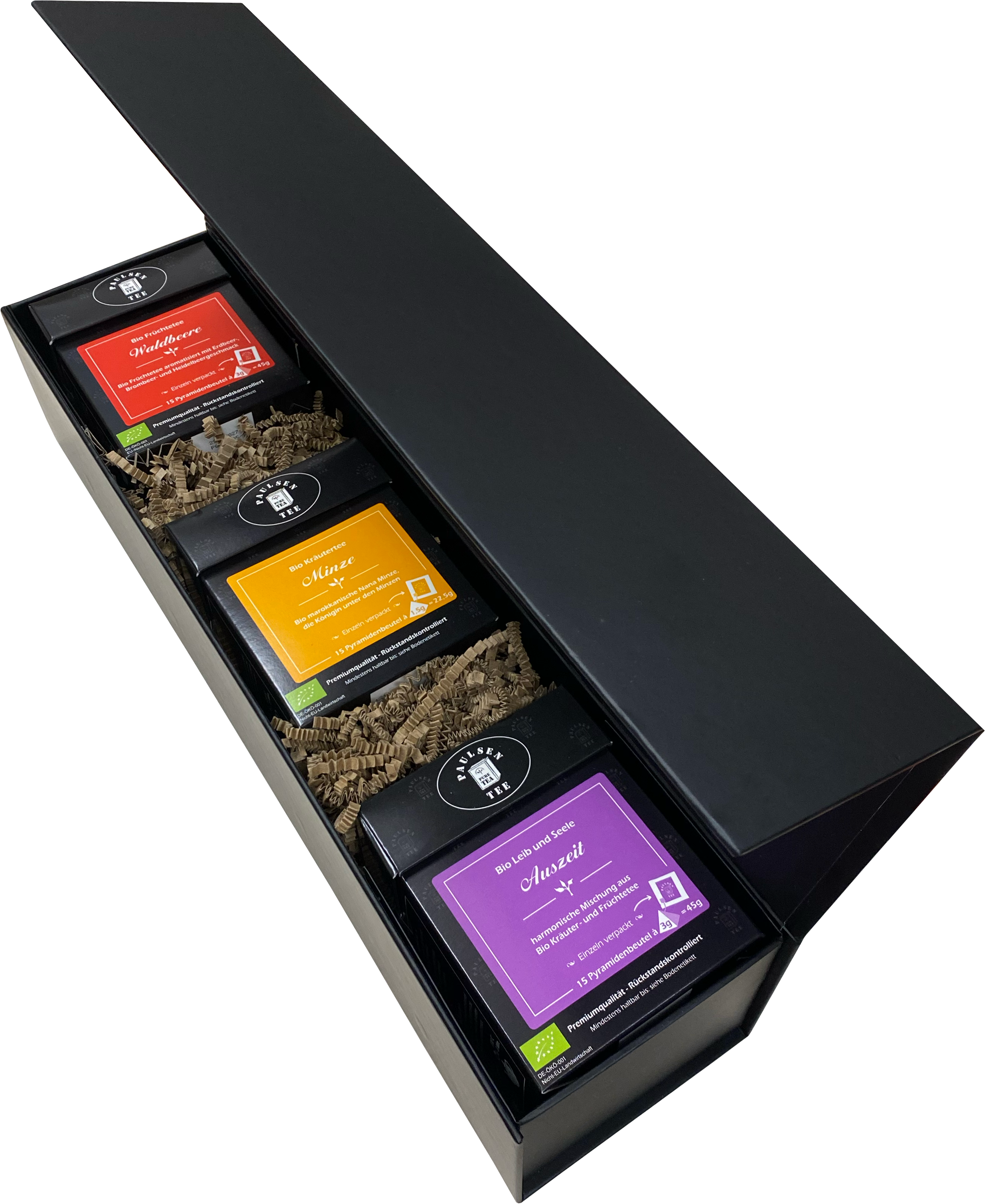 In einem hochwertigen Geschenkkarton mit Magnetverschluss präsentieren wir drei verschiedene Bio Tees aus unserem Pyramidenteebeutelsortiment.