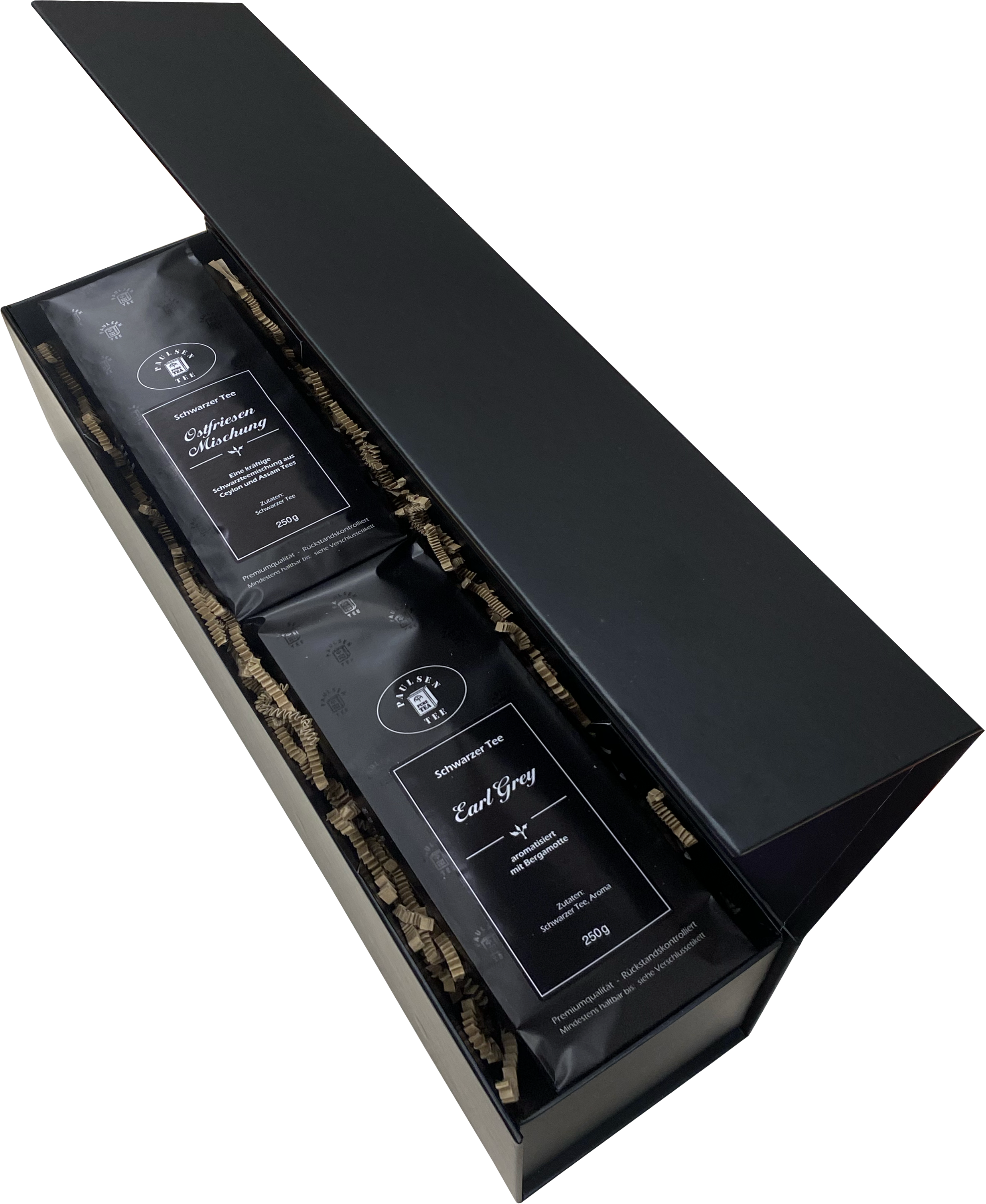 In einem hochwertigen Geschenkkarton mit Magnetverschluss präsentieren wir unseren Earl Grey und die Ostfriesen Mischung.