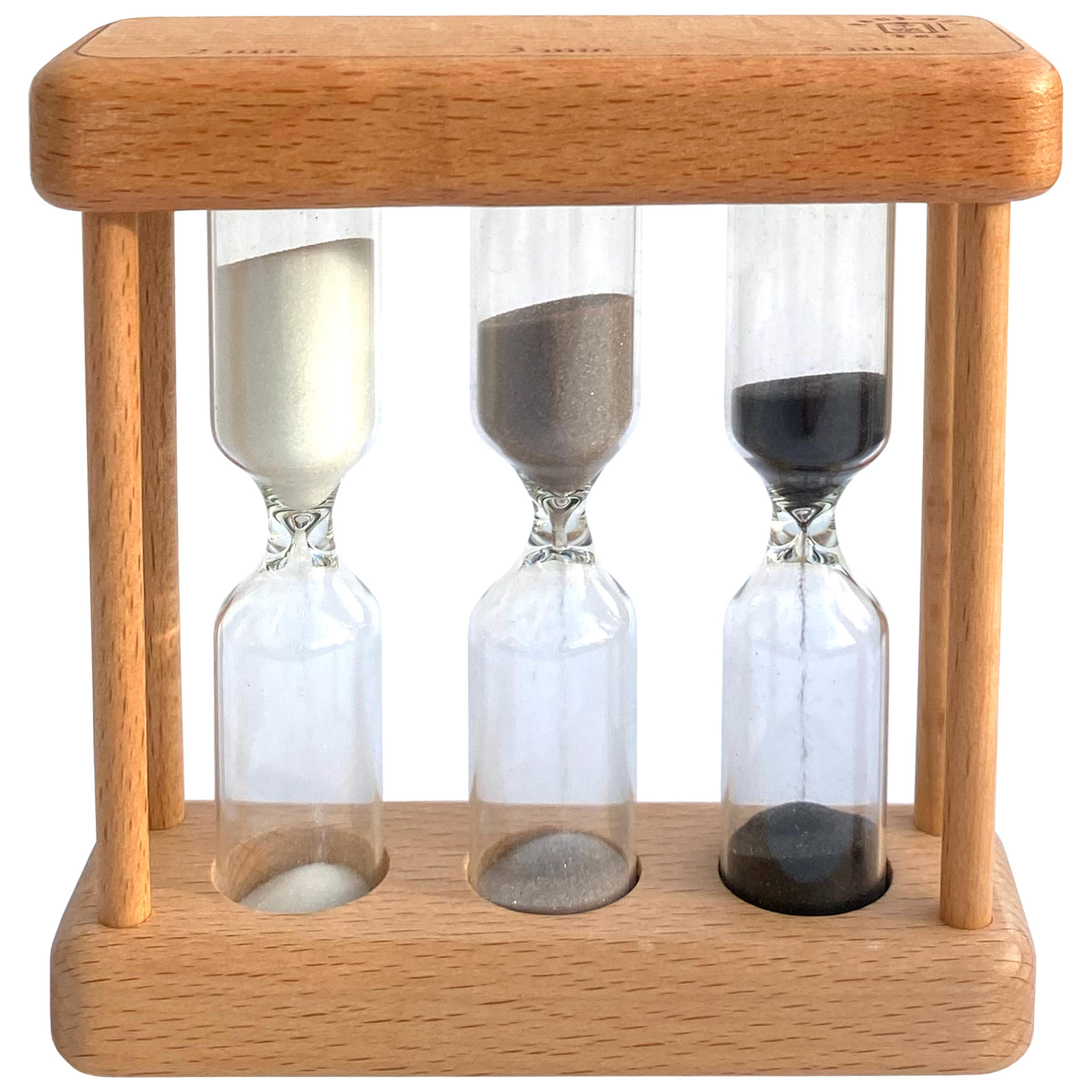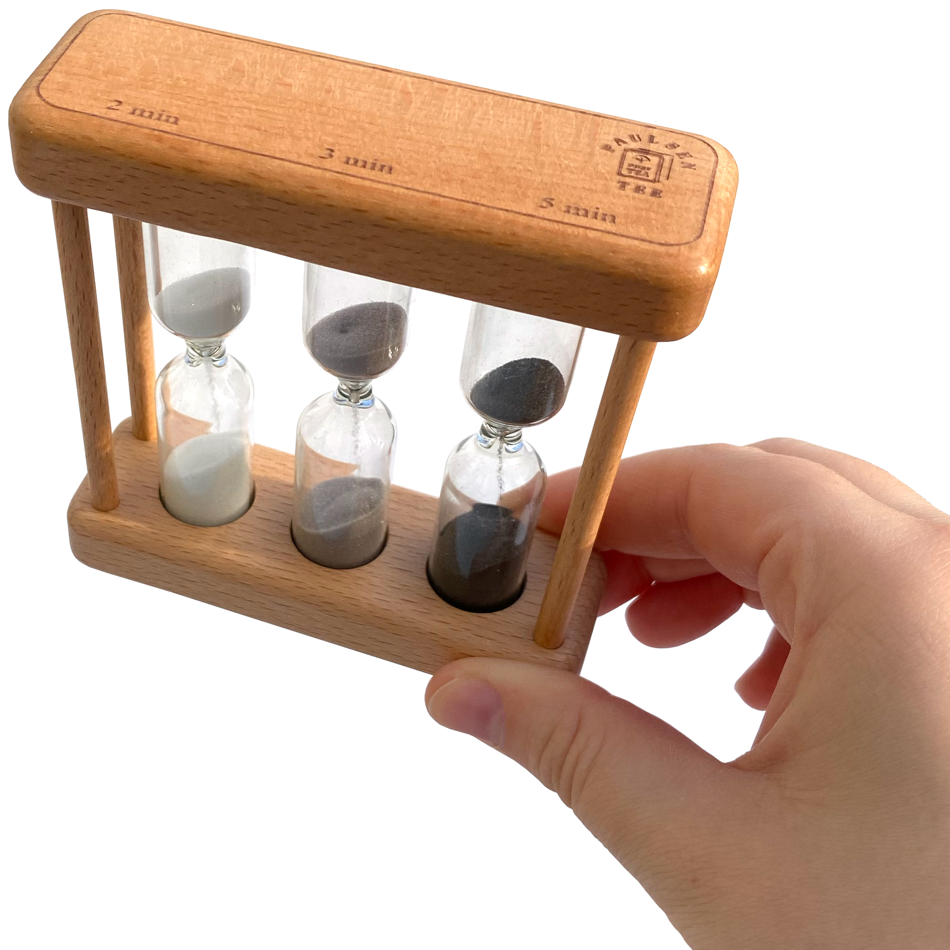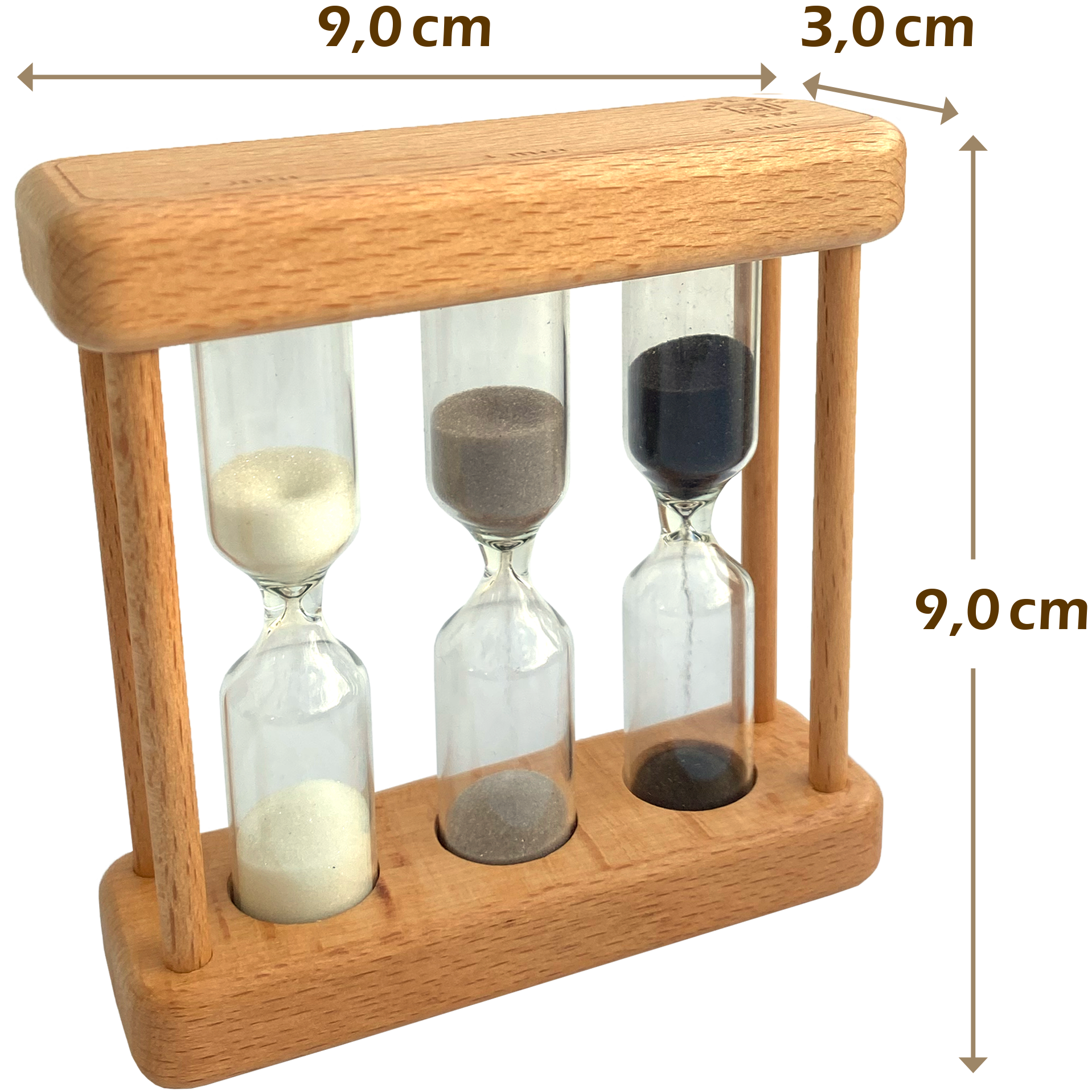 Eine Sanduhr aus Glas und Bambus. Die 3 Kolben messen unterschiedliche Zeiten, 2, 3 und 5 Minuten. Sie können sie dementsprechend für verschiedene Teesorten nutzen.