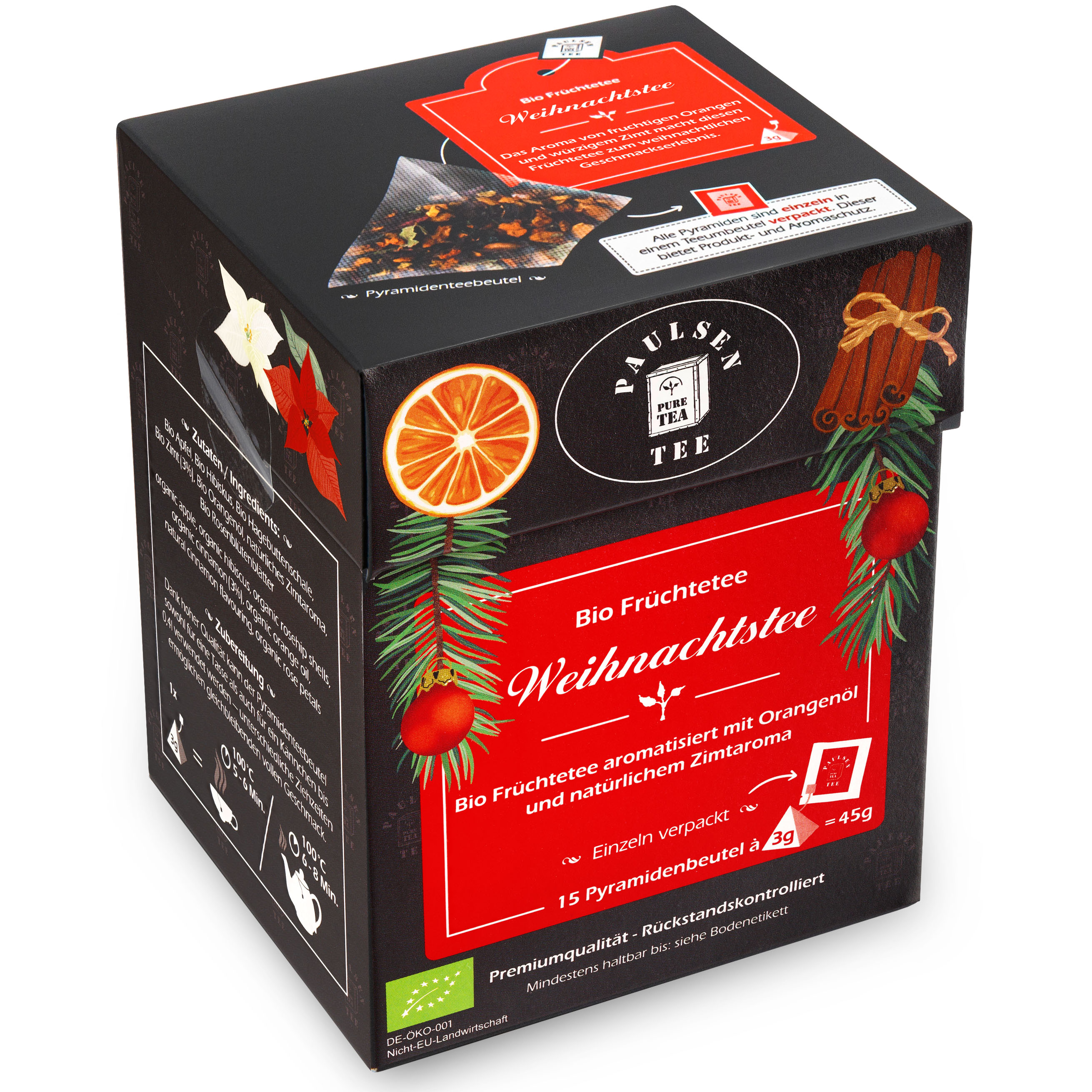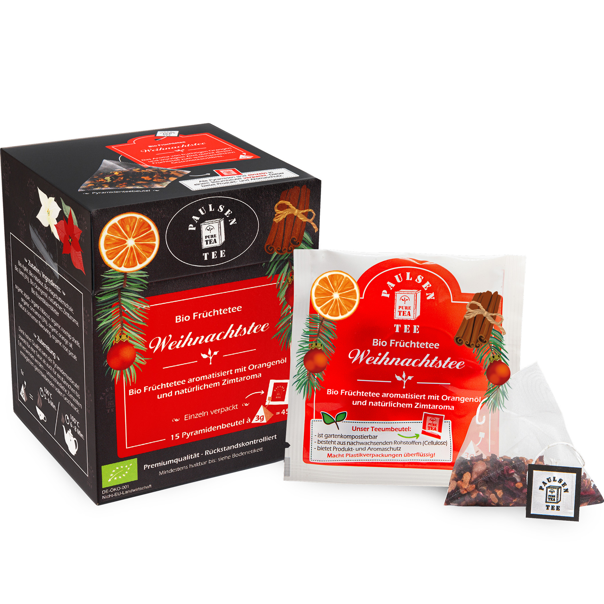 Das Aroma von fruchtigen Orangen und würzigem Zimt macht diesen Früchtetee zum weihnachtlichen Geschmackserlebnis. Genießen Sie den koffeinfreien Bio Weihnachtstee gesüßt oder pur, um sich in eine adventliche Festtagsstimmung zu versetzen.
